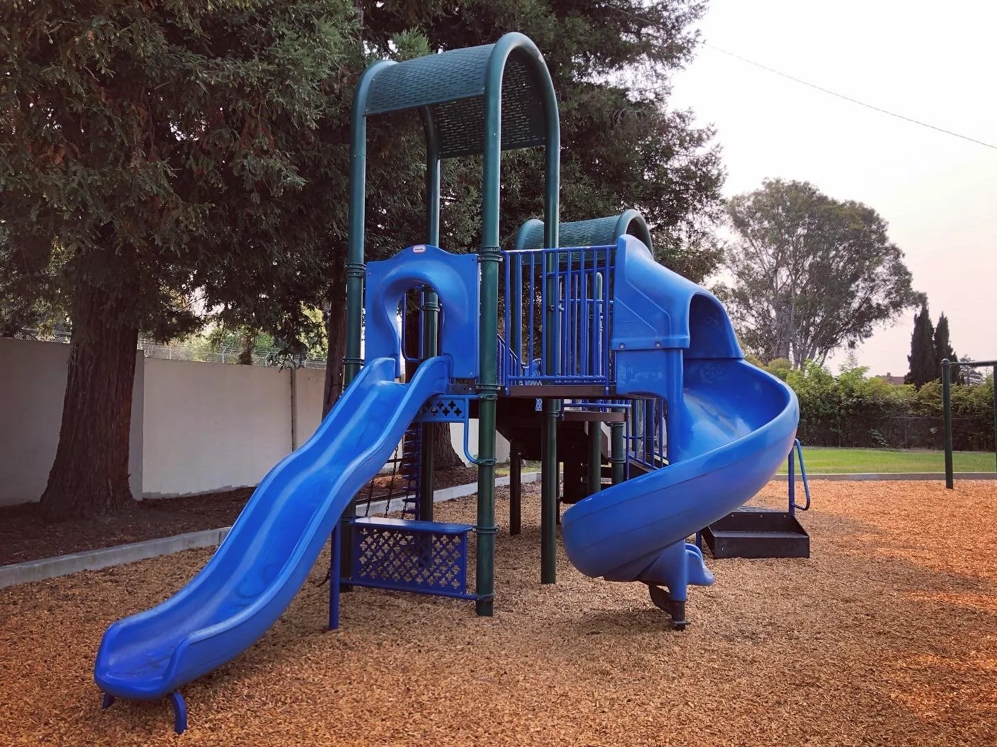 This small neighborhood park is so hidden I didn’t even see it on Google maps. The play area has a structure, standard swings, and a tire swing. The structure has two slides (bumpy and spiral) steps, ladders (including a chain ladder), a steering wheel, monkey bars, and an underneath counter perfect for serving up a woodchip sandwich.