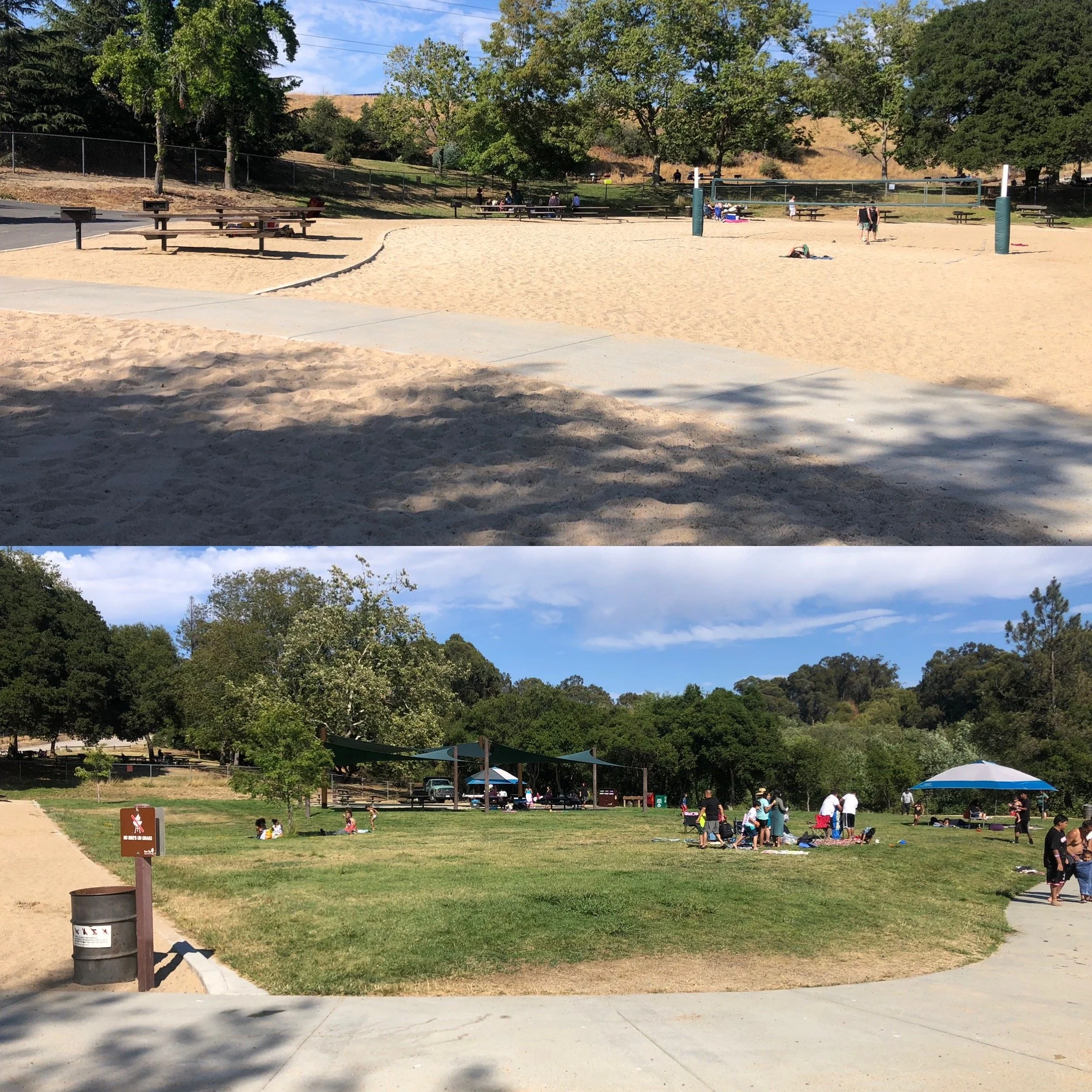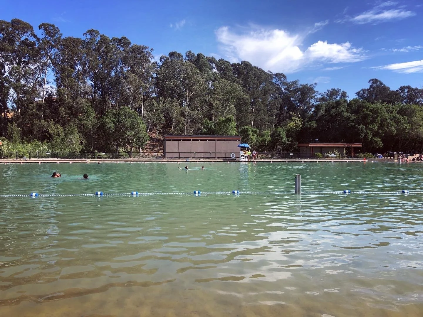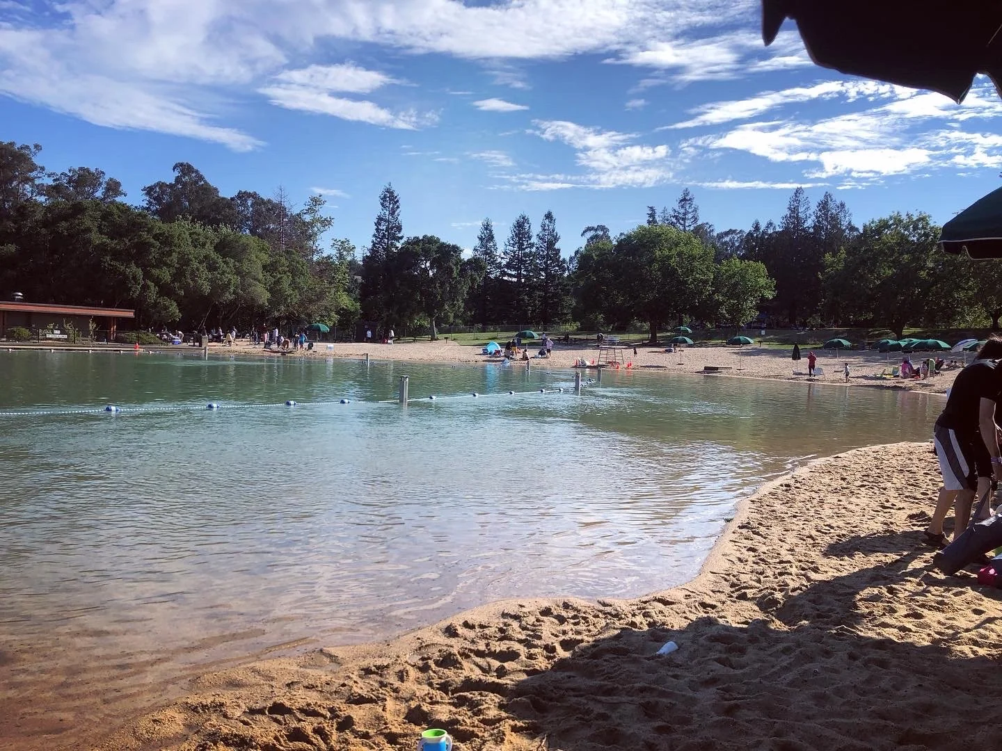 The swim area is great for all ages and levels of water comfortably. There are lifeguards, free-to-borrow life vests, and marked-off shallow areas. Swim fees are free under 1 year, $2.00 age 1-15, $3.00 age 16-61, $2.00 seniors 62+ or disabled. Pro tip: get the East Bay Regional Parks Family Pass for $105 for the year and gets free swim and parking at ALL EBRP spots!! Every so often the kiddos must take a 15 min water break and sand toys or snacks are a must to keep those water-loving kiddos occupied. All who pass a swim test are allowed access to the deep end including the deck for jumping off. There isn’t much natural shade on the sand area, but umbrellas are available first come first serve. You are also allowed to bring your own. There are picnic tables, bbqs, and grass both inside and outside of the swim fence. Three picnic areas inside the swim fence are reservable. Swim fee still applies. Bathrooms and showers are available.