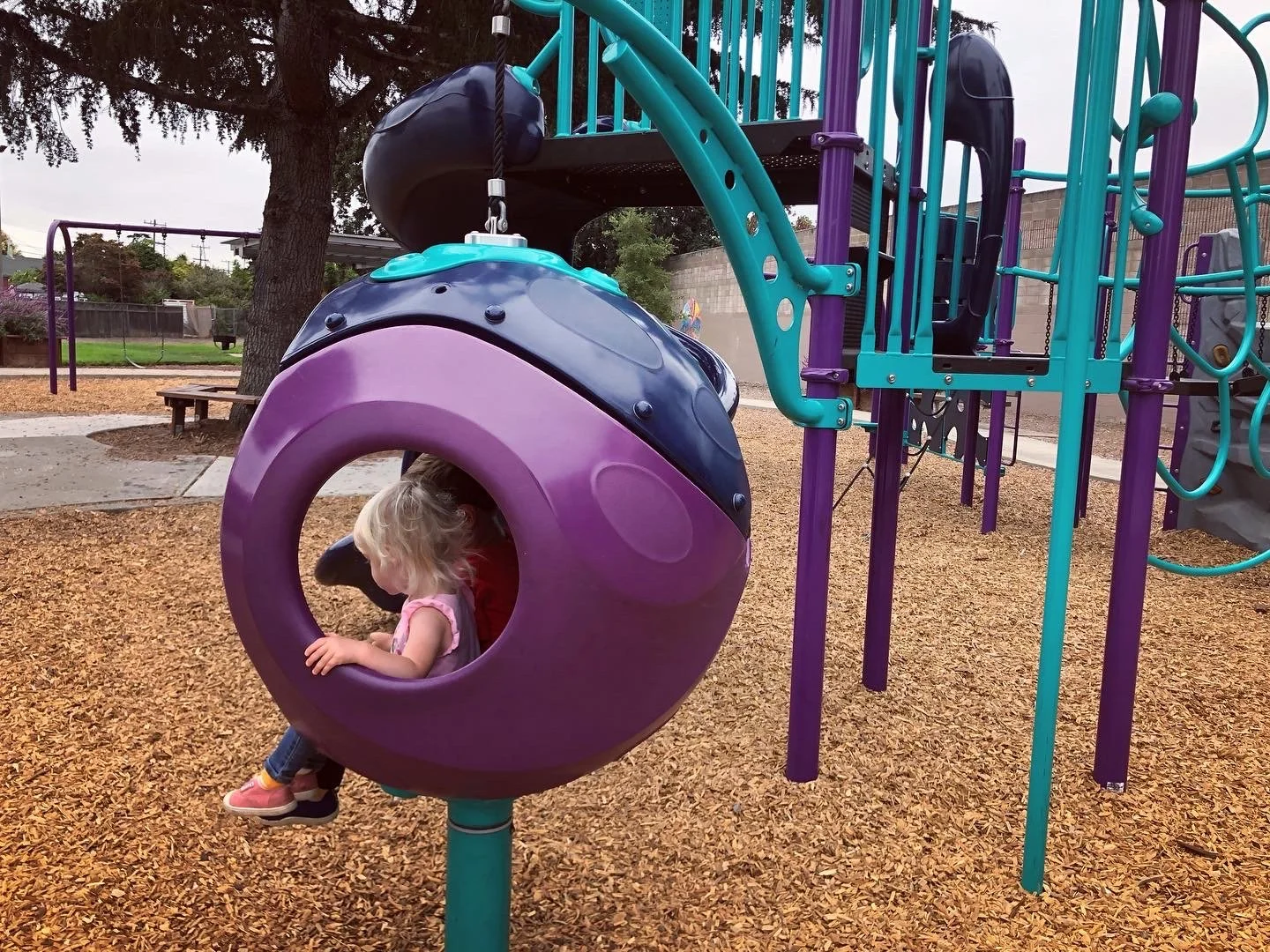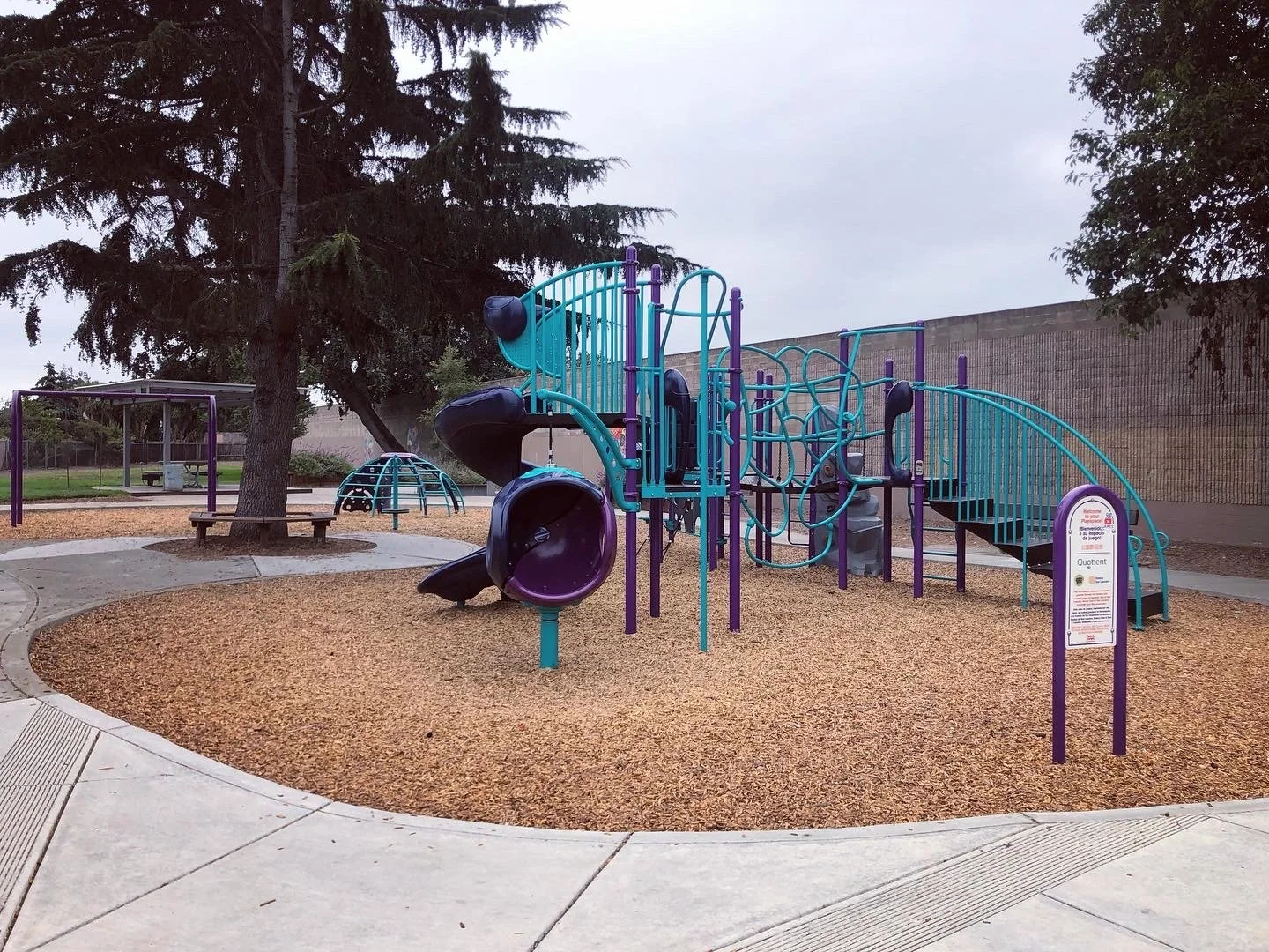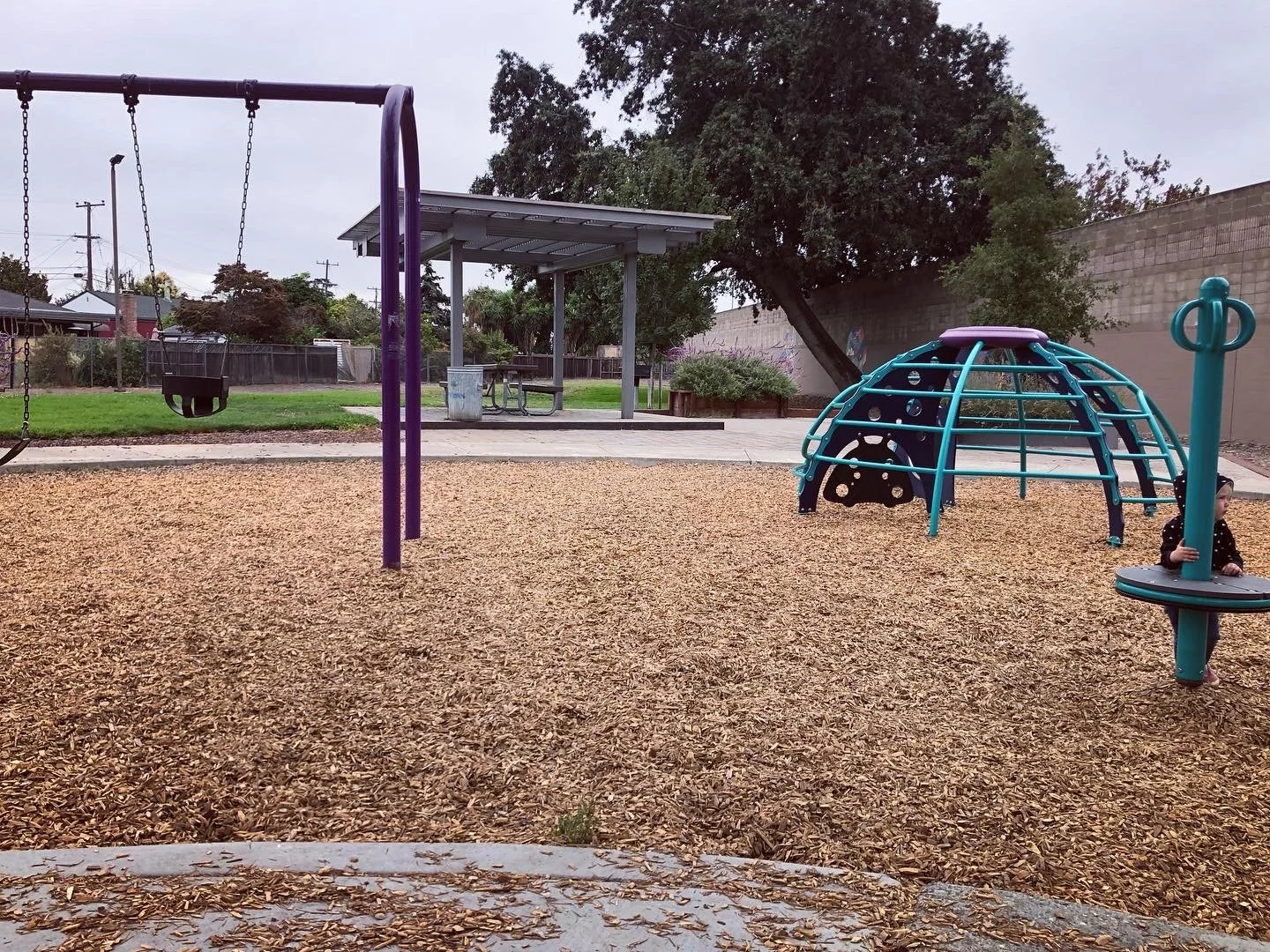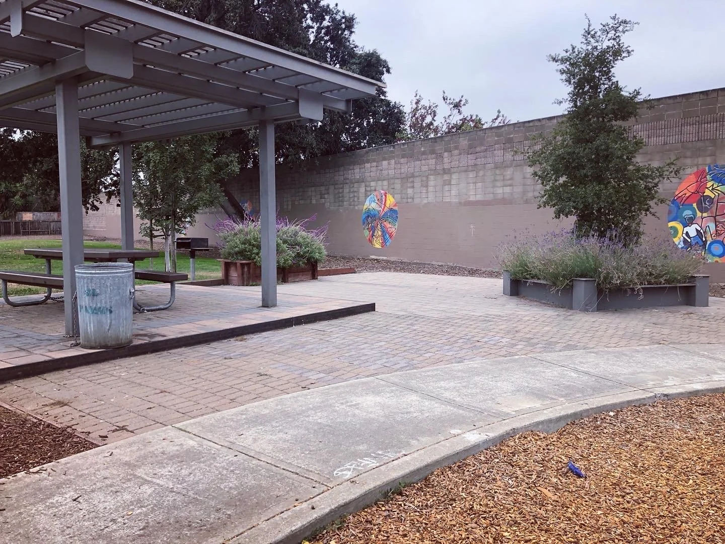 On the grassy area there is a bucket ball past and a hoop ball post. Beyond the play area, is a covered picnic area with bbq. I particularly liked the art painted on the cement wall that separates the park from the freeway.