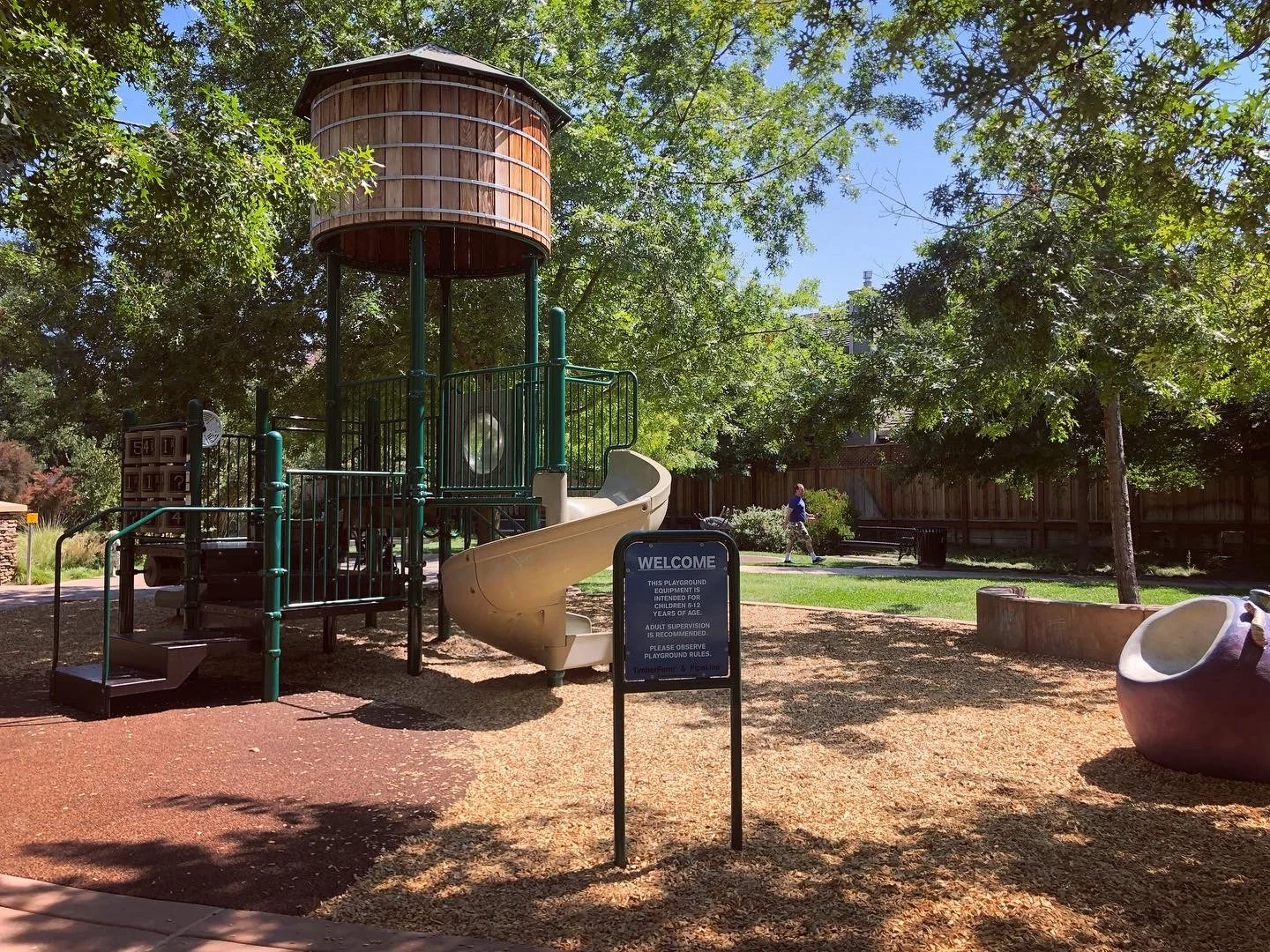 Although it appears tall with the water tower on top, the structure itself is low. There are two slides (a wide and a spiral), steps, an inclined ladder, activities, a look out bubble, and an underneath play area.